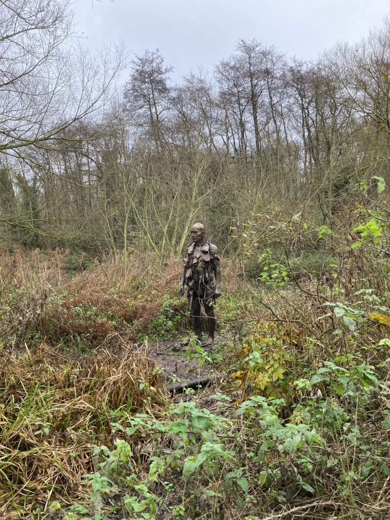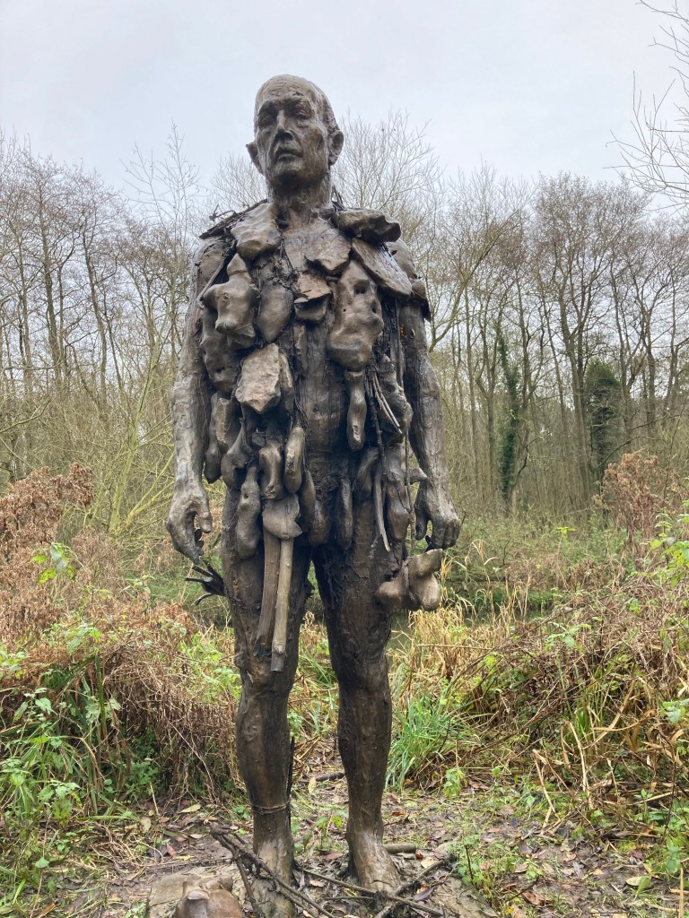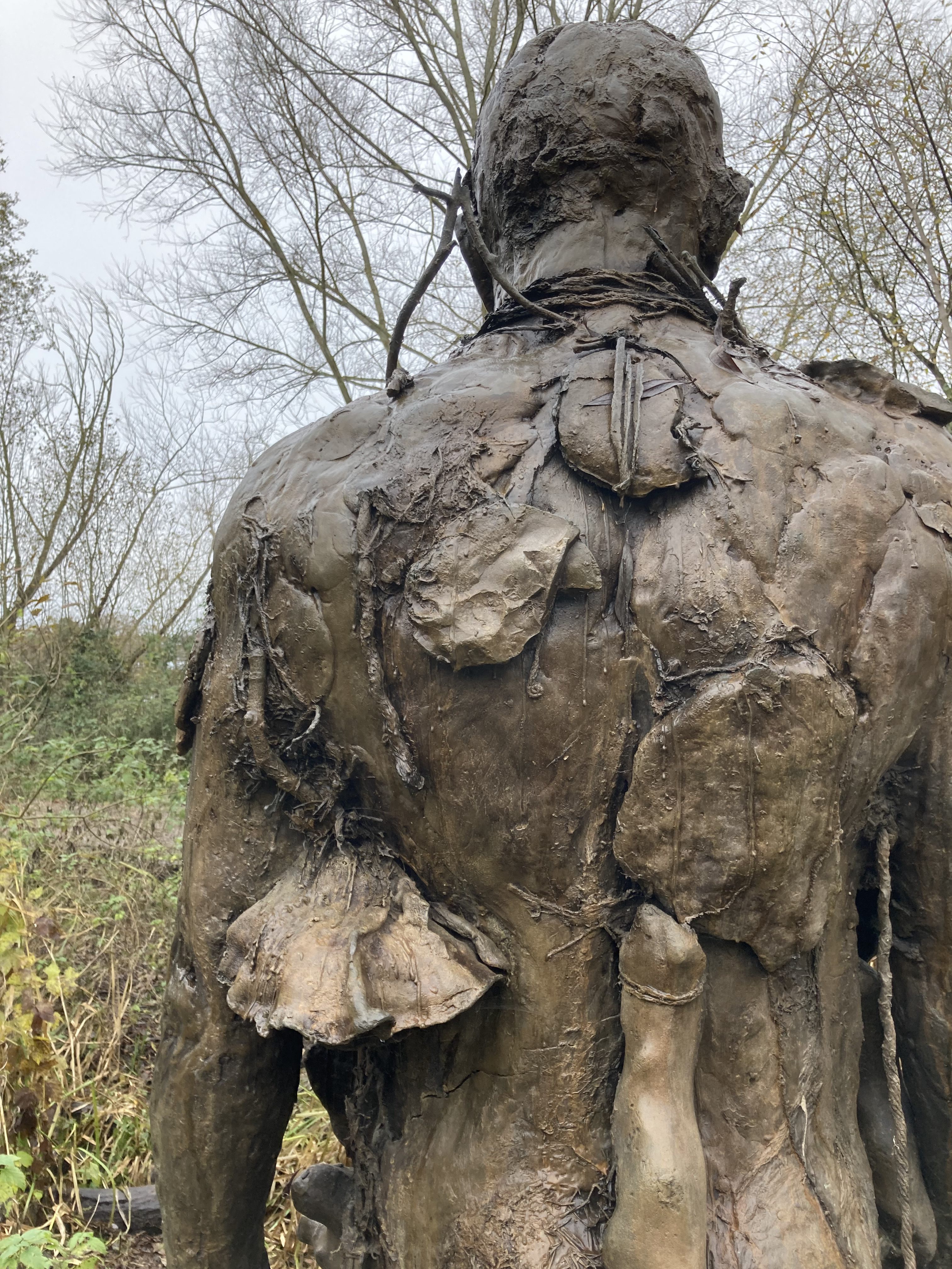 In recent weeks I’ve made an unusual acquaintance. The Man of Stones is an 8ft bronze sculpture by Laurence Edwards, sited in the University of East Anglia sculpture park. The sculpture stands in a reed bed between the university Broad and the river Yare. He is a striking and imposing figure with all manner of natural objects draped and hung around his body, some even accreted to him or growing for him. Foremost amongst these are a set of large flints hung on twine around his neck.