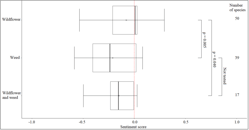 Results indicate that socio-ecological perceptions of arable plants largely held true between the first agricultural revolution and the present. The median sentiment score for species currently categorised as ‘wildflowers’ (0.008) was statistically significantly more positive than for species categorised as ‘weeds’ (-0.239) (p = 0.005) and as ‘weed and wildflower’ (-0.155) (p = 0.040) (Figure 3). Cornflower was one of few species to include explicitly positive language (among otherwise negative sentiment): ‘Enlivens fields by the brilliancy of its colour’.[33] Notably, this species has long been identified as aesthetically and culturally important.[34]