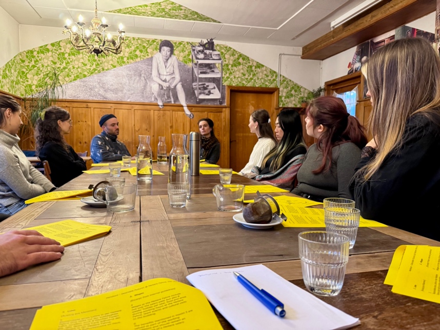 The seminars were followed by an excursion to ‘The Heitere Fahne’, an inclusive cultural venue in Wabern near Bern.[16] Theatre performances (and open theatre ateliers), concerts, artistic events, festivals, weddings, conferences and birthday parties are held at ‘The Heitere Fahne’ thanks to the dedicated work of a diverse team of around forty people and numerous volunteers from different backgrounds. As a ‘nowtopia’, the ‘Heitere Fahne’ is guided by a powerful visioning question: ‘How do we want to have lived?’ and tries to translate this into practice. With more than ten years of experience in implementing visions of desirable futures, ‘The Heitere Fahne’ team brought a practical perspective to the course. Students had lunch with the staff, engaged in the open theatre ateliers and engaged in discussions of funding and management with members of ‘The Heitere Fahne’.