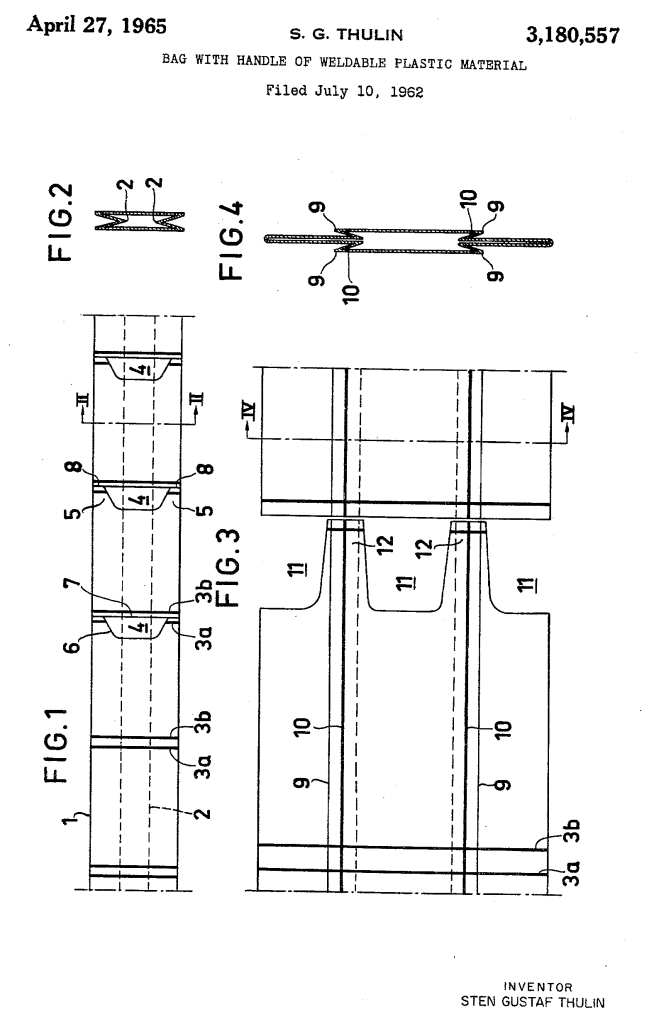 [2] S.G. Thulin, ‘Bag with handle of weldable plastic material’, Google Patents, 27 April 1965: https://patents.google.com/patent/US3180557A/en.