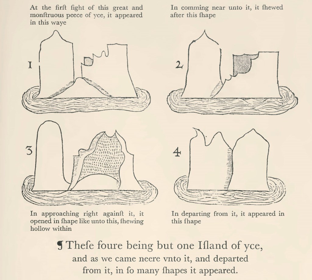 One of the earliest depictions of an iceberg appears in a travelogue recounting Martin Frobisher’s third Arctic voyage in 1578. The author, Thomas Ellis, reported ‘a maruellous huge mountaine of yce’, and supplemented his description with a series of four drawings – this iceberg was so large and visually complex that a single image could not suffice to convey an adequate representation.