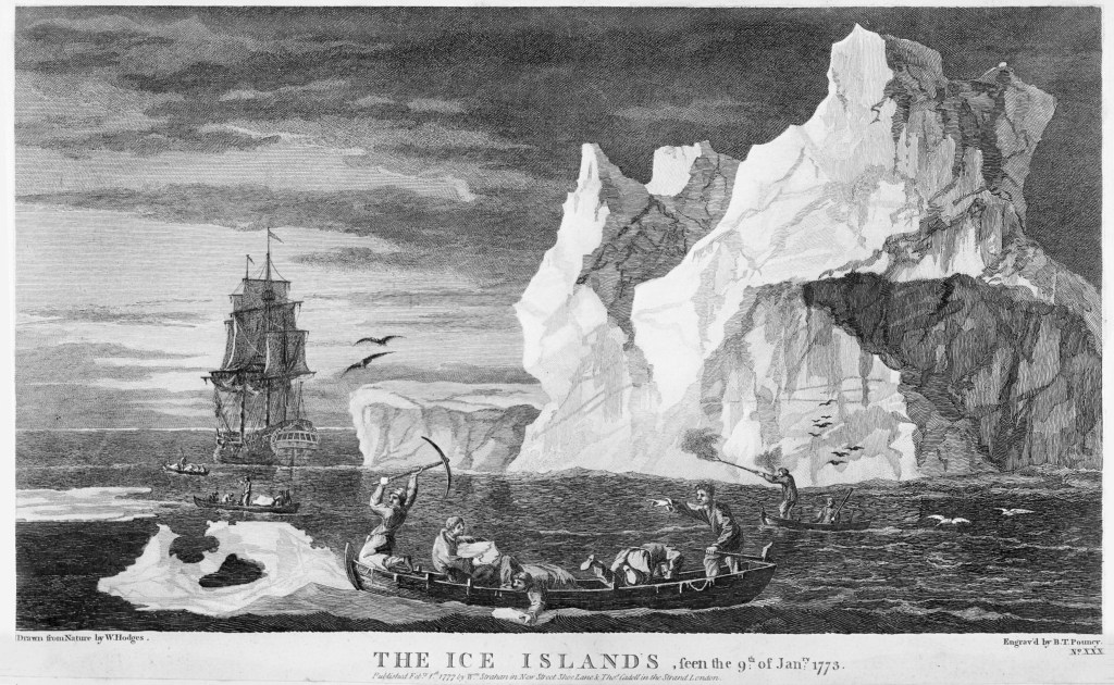 The artist behind this illustration was John Cleveley Jnr. The fact that Phipps employed a renowed artist indicates the priority given to visual representations in exploration accounts in the late eighteenth century. Consequently, James Cook hired William Hodges for his second journey, 1772–1775. Cook’s A Voyage Towards the South Pole and Round the World (1777) includes an illustration of icebergs from Antarctica, produced by Hodges, titled The Ice Islands.